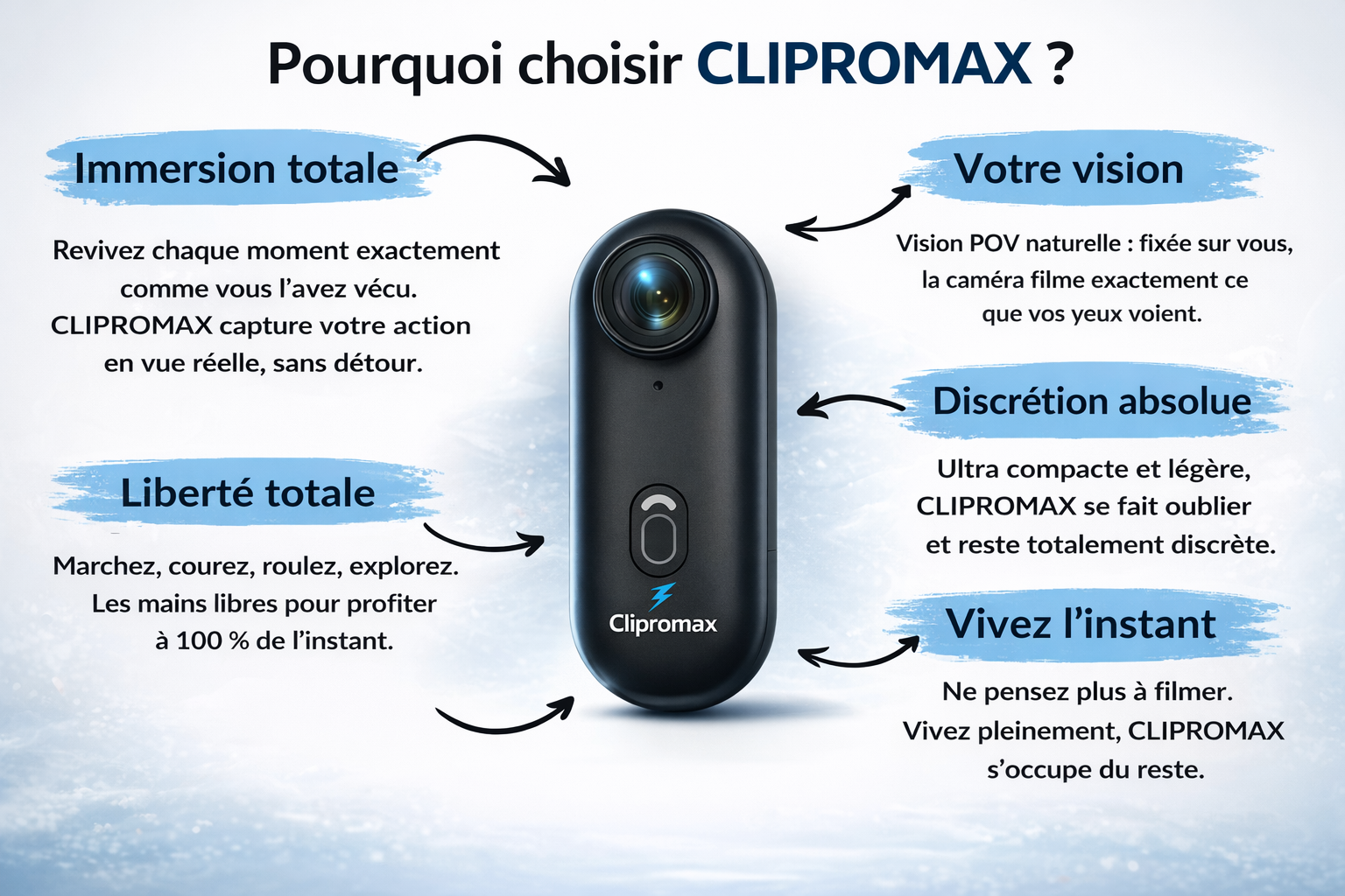 Clipromax est une caméra ultra-compacte et mains libres qui vous permet de filmer vos moments sans sortir votre téléphone.